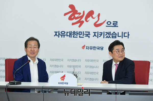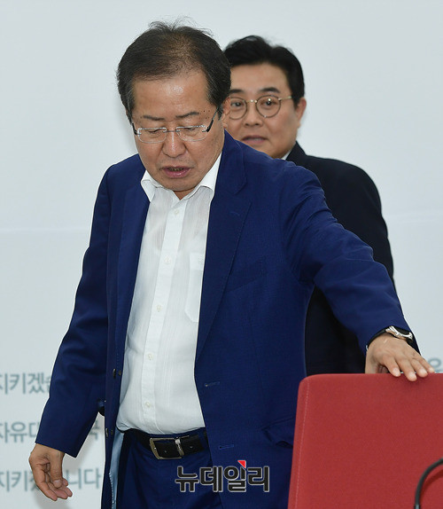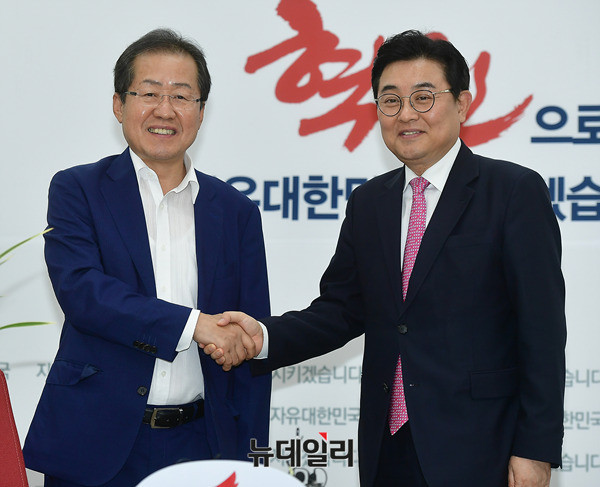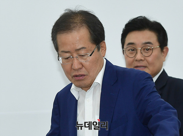 • 홍준표 자유한국당 신임대표가 4일 오후 국회 자유한국당 대표실에서 전병헌 청와대 정무수석에게 문재인 대통령의 축하 화환을 전달 받고 있다. 이날 면담은 비공개 진행됐다. 홍 신임 대표는 면담 직후 추미애 더불어민주당 대표를 예방했다.