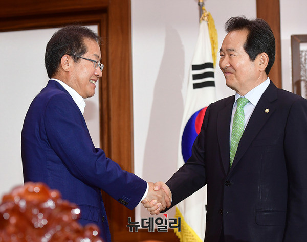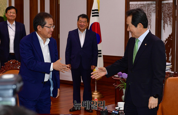 홍준표 자유한국당 신임 대표가 5일 오전 국회 국회의장실에서 정세균 국회의장을 예방해 악수를 나누고 있다.