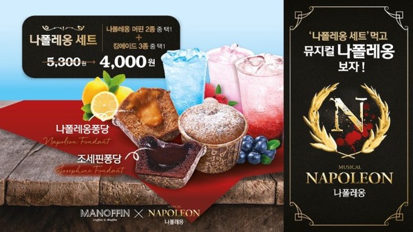 뮤지컬 '나폴레옹'이 커피&머핀 전문 브랜드 마노핀과 함께 콜라보 세트를 출시하며, 7월 30일까지 한정 판매한다스페셜 에디션 '나폴레옹 세트'는 세기의 연인인 두 주인공 나폴레옹과 조세핀 머핀 2종과 황제를 연상하는 킹(King) 에이드 음료 3종으로 구성됐다.프랑스 1대 황제인 나폴레옹의 이름을 딴 '나폴레옹 퐁당'은 머핀 속 살살 녹는 황금 빛 카라멜 필링이 들어있으며, 팜프파탈 매력의 조세핀의 이름을 딴 '조세핀 퐁당'은 촉촉한 초코 머핀 속 가나슈 필링이 함유돼 달콤함을 느낄 수 있다.황제를 연상시키는 3종류의 킹 음료 에이드는 블랙 킹(레몬보다 비타민C가 많은 블랙커런트의 베리에이드), 블루 킹(상큼한 레몬과 푸른 청량감의 시원한 레몬에이드), 핑크 킹(상큼한 열대과일 리치로 만든 로맨틱한 핑크 리치에이드)이다.판매 기간 동안 '나폴레옹 세트'를 구매한 고객을 대상으로 뮤지컬 '나폴레옹' 관람권을 증정하는 이벤트를 진행한다. 응모기간은 7월 30일까지며, 당첨자는 8월 7일 발표할 예정이다.뮤지컬 '나폴레옹'은 로마제국 이후 가장 넓은 유럽을 정복한 인물 나폴레옹의 야망과 정치, 사랑을 통해 지도자로서 그의 여정을 다룬다. 7월 13~14일 프리뷰를 시작으로 15일 잠실 샤롯데씨어터에서 개막한다. 관람료 6만~14만원.[사진=쇼미디어그룹]
