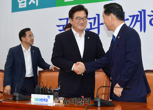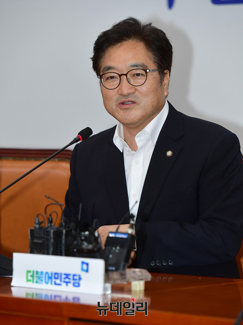 우원식 더불어민주당 원내대표가 5일 오후 국회 더불어민주당 원내대표실에서 김상곤 사회부총리 겸 교육부 장관을 만난 자리에서 모두 발언을 하고 잇다. 김 장관은 지난 4일 청와대 충무실에서 문재인 대통령으로 부터 임명장을 수여 받았다.