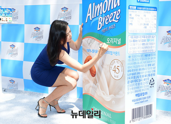 배우 이하늬가 6일 오전 서울 중구 올리브영 명동 프래그십 스토어에서 열린 '건강한 여자가 아름답다 Try it! 아몬드 브리즈' 포토행사에 참석해 제품모형에 사인을 하고 있다. 이하늬는 사인 아래 "건강한 아름다움이 최고"라고 적었다.