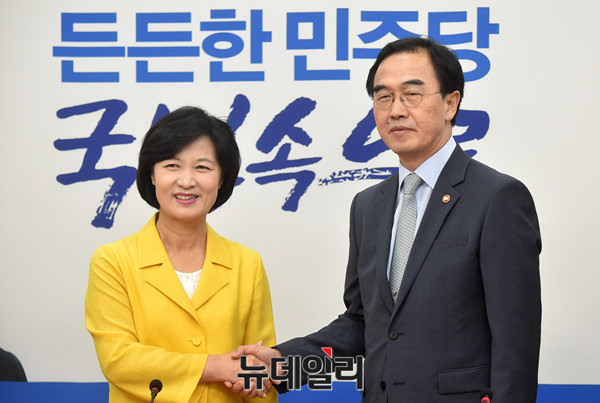 추미애 더불어민주당 대표가 6일 오전 국회 당 대표실을 찾은 조명균 신임 통일부 장관과 인사를 나누고 있다.