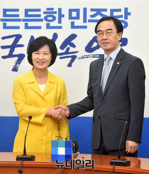 [포토] 추미애 대표 찾은 조명균 신임 통일부 장관