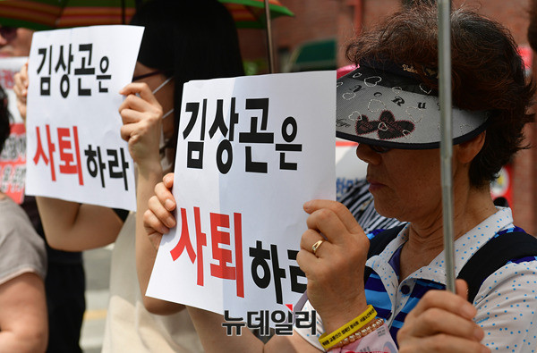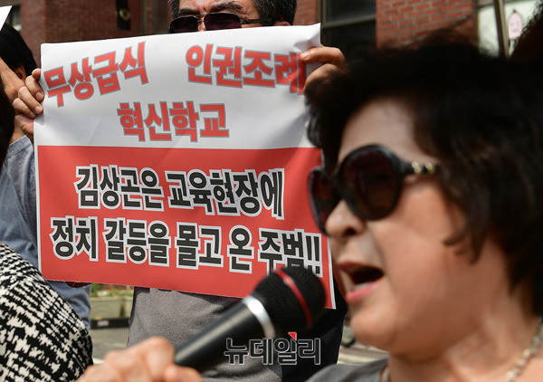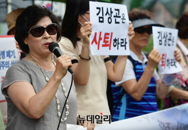 이경자 전국학부모교육시민단체연합 공동대표가 6일 오후 서울 종로구 청운효자동 주민센터 앞에서 열린 김상곤 신임 교육부장관의 사퇴를 촉구하는 기자회견에서 발언하고 있다.