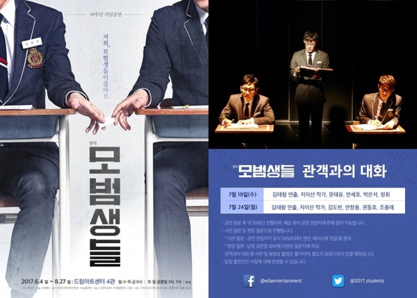 10주년 기념 공연 연극 '모범생들'이 관객과의 대화를 개최한다.연극 '모범생들'은 대학로에서 가장 사랑 받는 창작 콤비인 김태형 연출과 지이선 작가가 10년 전 함께한 작품으로, 일명 '지탱극'의 시작점이라 할 수 있다.오는 19일과 24일 열릴 '관객과의 대화' 시간에는 김태형 연출, 지이선 작가와 10주년 공연을 함께 하고 있는 안세호, 김도빈, 조풍래, 문태유, 박은석, 권동호, 안창용, 정휘 배우가 참여해 진솔하고 심도 깊은 이야기를 나눌 예정이다.이번 관객과의 대화는 해당 회차 공연을 관람하는 관객이라면 누구나 참석할 수 있으며, 공식 SNS를 통해 받은 사전 질문과 공연 당일 현장 질문으로 구성된다.연극 '모범생들'은 특목고 고3 학생들을 통해 비틀어진 교육 현실과 경쟁 사회를 그려낸다. 소위 모범생으로 통하는 4명의 캐릭터를 배우마다 본인만의 색깔로 표현해 뚜렷한 해석과 공감 가는 연기로 그들이 겪는 열등감과 강박관념을 세련되게 풀어냈다.8월 27일까지 대학로 드림아트센터 4관에서 만날 수 있다. 전석 5만원. 문의 1588-5212.[사진=이다엔터테인먼트, 쇼플레이]