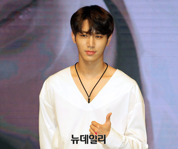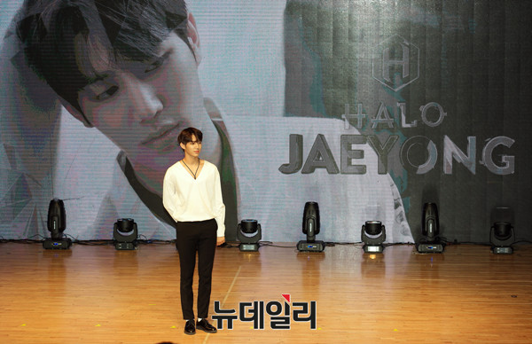보이그룹 헤일로 멤버 재용이 6일 오후 서울 강남구 일지아트홀에서 열린 세 번째 미니앨범 '히얼 아이 앰(Here I AM)' 발매 기념 쇼케이스에 참석해 포토타임을 갖고 있다.
