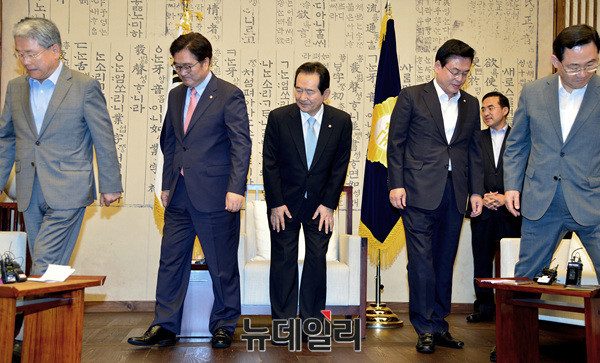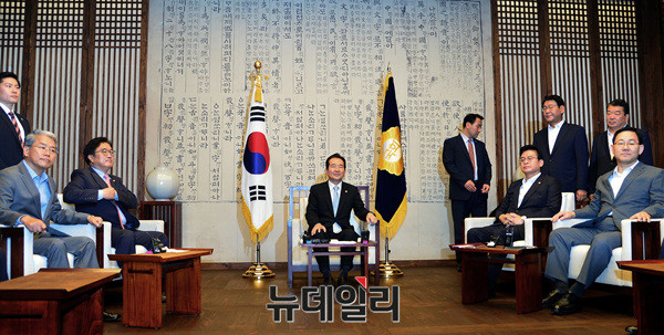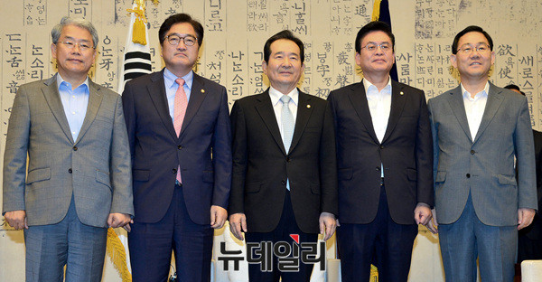 정세균 국회의장이 10일 오전 국회의장접견실에서 우원식 더불어민주당, 김동철 국민의당, 정우택 자유한국당, 주호영 바른정당 원내대표와 회동하고 있다. 이날 정 의장과 4당 원내대표들은 추경안, 정부조직법 개정안 처리 등 국회 정상화 방안을 논의할 예정이다.
