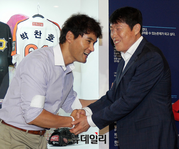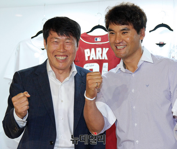 전 야구선수 박찬호와 스포츠해설가 차범근이 10일 오전 서울 중구 그레뱅뮤지엄에서 열린 '스타탐구전 박찬호' 오픈 기념 행사에 참석해 포즈를 취하고 있다.
