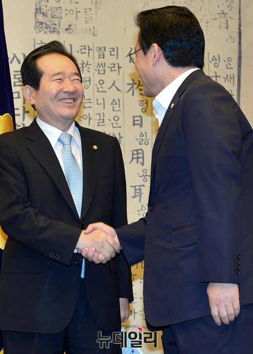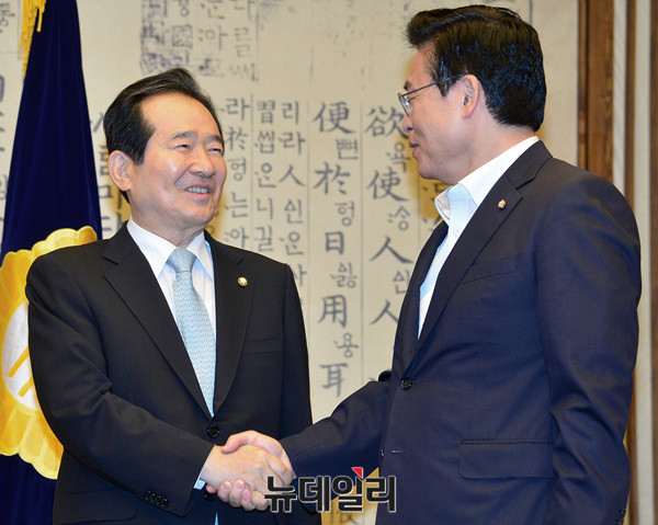정세균 국회의장과 정우택 자유한국당 원내대표가 10일 오전 국회의장접견실에서 열린 4당 원내대표 회동에 참석해 악수를 나누고 있다. 이날 정 의장과 4당 원내대표들은 추경안, 정부조직법 개정안 처리 등 국회 정상화 방안을 논의할 예정이다.
