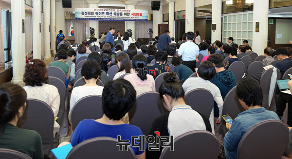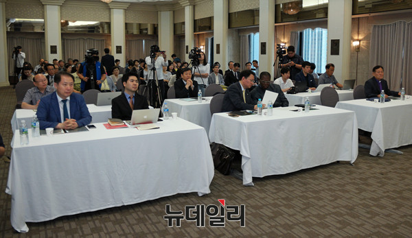 최충하, 김수읍, 박위근 목사, 조셉 아고 주한 가나 대리대사 등 '동성애와 에이즈 확산 예방을 위한 국제포럼' 참석자들이 10일 오후 서울 중구 한국프레스센터에서 기념촬영을 하고 있다.