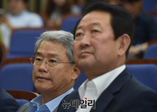 박주선 국민의당 비상대책위원장과 김동철 원내대표가 10일 오후 국회에서 열린 긴급의원총회에 참석해 대화를 나누고 있다.