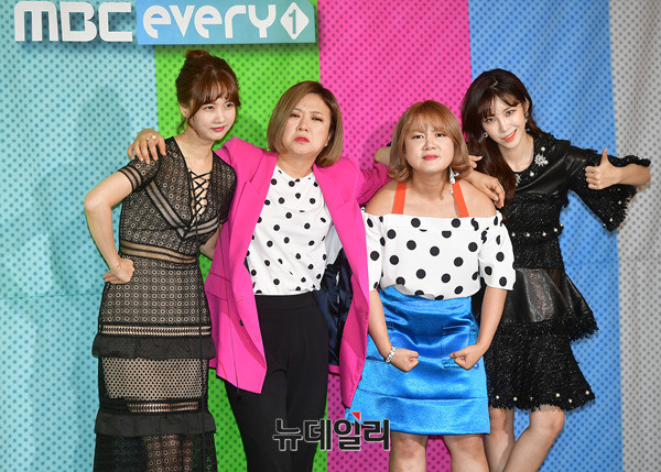 박소현, 김숙, 박나래, 전효성(왼쪽부터)이 11일 오전 서울 마포구 아만티호텔에서 열린 비디오스타 1주년 기자간담회에서 포토타임을 갖고 있다. 이날 1주년 기념 기자간담회에서 출연자들의 비키니 사진이 공개됐다.