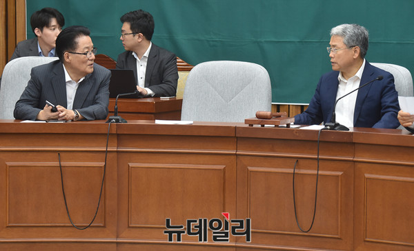 국민의당 박지원 의원이 11일 오후 국회에서 열린 의원총회에 참석해 김동철 원내대표와 대화를 나누고 있다.