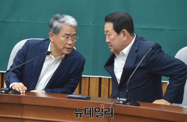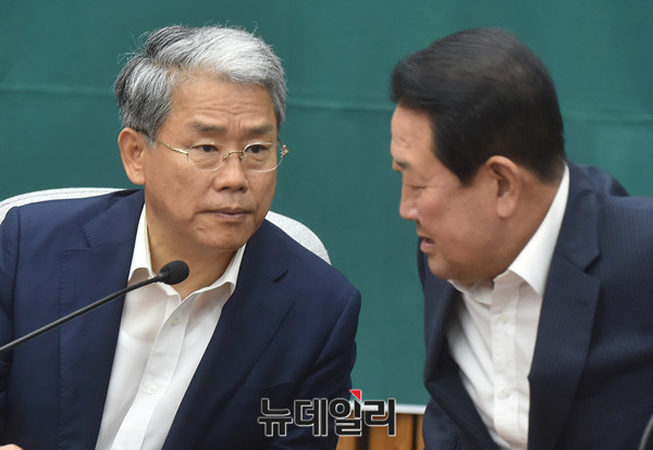 국민의당 박주선 비대위원장과 김동철 원내대표가 11일 오후 국회에서 열린 의원총회에 참석해 대화를 나누고 있다.