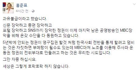 홍준표 자유한국당 대표는 11일 논란이 일고 있는 MBC 특별근로감독 사태에 대해 "노조를 이용해 주사파 운동권 정권의 전위부대로 만들려는 것은 무리한 시도"라고 지적했다.홍 대표는 자신의 페이스북을 통해 "신문 장악하고 종편 장악하고 포털 장악하고 SNS까지 장악한 정권"으로 문재인 정부를 겨냥하고, "마지막 남은 공영방송인 MBC 장악을 위해 온갖 수단을 다 동원하고 있다"고 꼬집었다.앞서 고용노동부는 MBC에 대해 지난달 29일부터 특별근로감독을 실시했다. MBC가 노조 조합원을 상대로 인사조치 등 탄압을 했다는 게 노동부 측의 입장이다.노동부는 감독관 9명을 투입한 대대적인 조사를 진행했고, 조사기간도 14일까지 당초 계획보다 4일 더 연장키로 했다.MBC 측은 "감독을 넘어선 사찰"이라며 "정치권력의 의도에 맞춘 표적조사"라고 반발하고 있다.