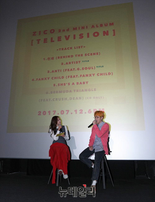 12일 오후 서울 마포구 홍대CGV에서 열린 두 번째 미니앨범 '텔레비전' 발매 기자간담회에 참석한 지코는 '텔레비전' 첫 번째 트랙인 '천재'를 가리켜 "제목과는 달리 가사에 반전이 숨어 있다"며 "'완벽주의'와 '타고난 천재' 같은 화려한 수식어 뒤에 가려진, 스스로를 탐구하고, 더 나음 음악을 만들기 위한 고뇌를 담아낸 곡"이라고 설명했다.노래에 귀를 기울여 보시면 가사에 반전이 숨어 있어요. 내용은 전혀 다릅니다. 부제로 'BEHIND THE SCENE'이 달린 걸 보면 아실 거예요. 나름대로 고뇌하고 노력하는 모습이나 좋은 수식어 뒤에 가려진 제 실상을 재미있게 풀어낸 노래입니다.