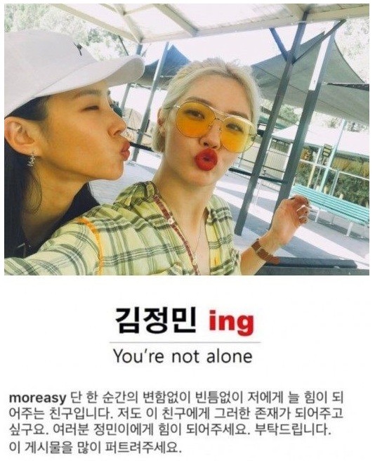 김새롬은 최근 자신의 인스타그램에 "김정민 ing, You're not alone"이라는 문구와 함께 "김정민은 자신에게 늘 힘이 되어주는 친구"라며 "여러분도 정민이에게 힘이 되어 달라"는 당부의 메시지를 올렸다.단 한 순간의 변함없이 빈틈없이 저에게 늘 힘이 되어주는 친구입니다. 저도 이 친구에게 그러한 존재가 되어주고 싶구요. 여러분 정민이에게 힘이 되어주세요. 부탁드립니다. 이 게시물을 많이 퍼트려주세요.