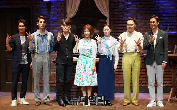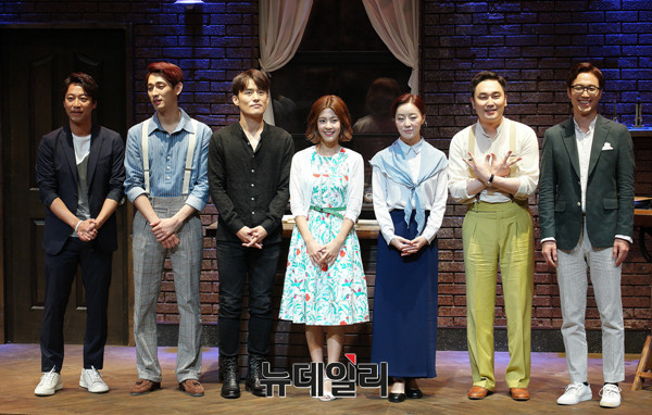 연출 오만석, 배우 윤박, 최재웅, 이윤지, 최유송, 서현우, 이명행(왼쪽부터)이 13일 오후 서울 종로구 아트원씨어터에서 열린 연극 '3일간의비' 프레스콜에 참석해 포토타임을 갖고 있다.
