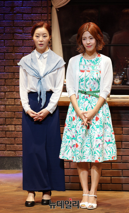 배우 이윤지와 최유송이 13일 오후 서울 종로구 아트원씨어터에서 열린 연극 '3일간의비' 프레스콜에 참석해 포토타임을 갖고 있다. 이들은 극에서 '낸'과 '라이나' 역을 맡았다.