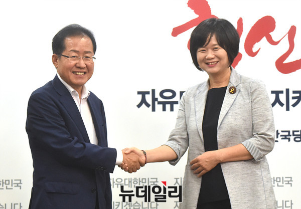 자유한국당 홍준표 대표가 13일 오후 서울 여의도 당사에 정의당 이정미 신임 대표만나 악수를 나누고 있다.