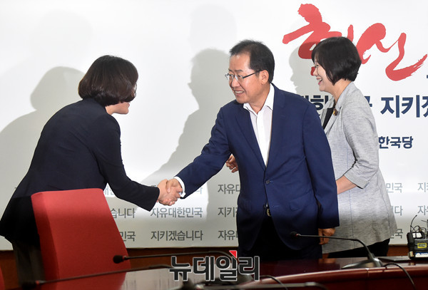 [포토] 악수 나누는 홍준표 자유한국당 대표와 정의당 이정미 신임 대표