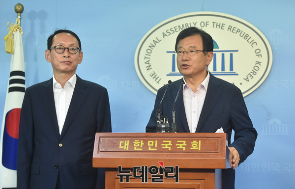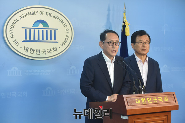 자유한국당 이현재 정책위의장과 김도읍 예산결산위원회 간사가 14일 오후 국회 정론관에서 추경관련 브리핑을 하고 있다.