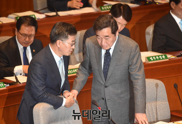이낙연 국무총리와 김동연 경제부총리 겸 기획재정부 장관 14일 오전 국회 예결위에서 대화를 나누고 있다.