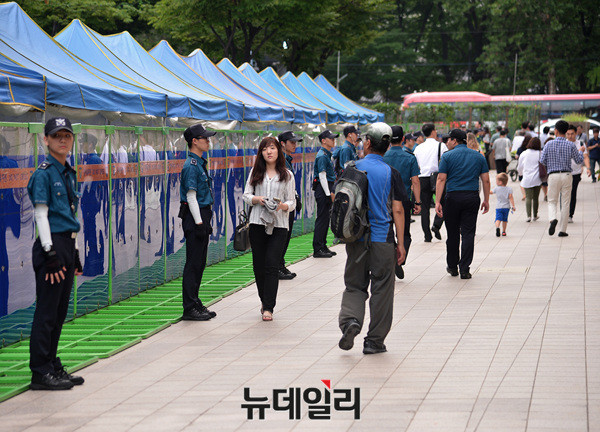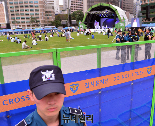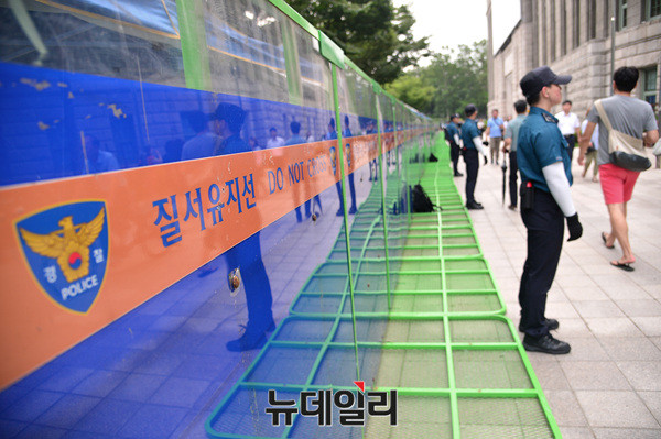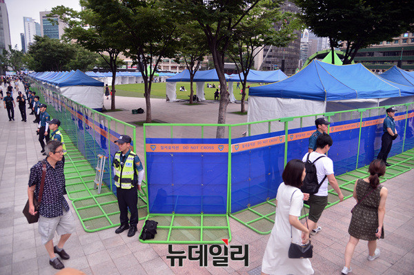 동성애 축제인 '2017 퀴어축제' 개막식이 열린 14일 오후 서울광장 주변이 경찰 펜스로 둘러싸여 있다. 이날 경찰은 축제 참가자와 기독교 단체 간 충돌을 방지하기 위해 양 구역을 차단하는 병력을 배치했다.