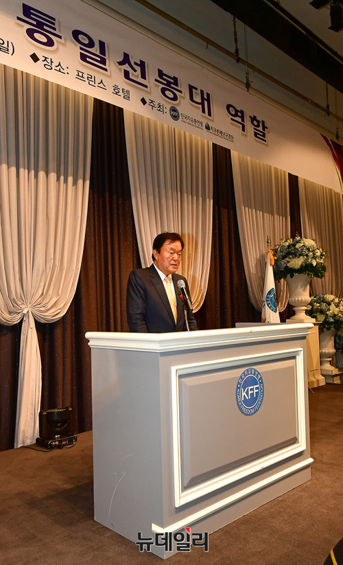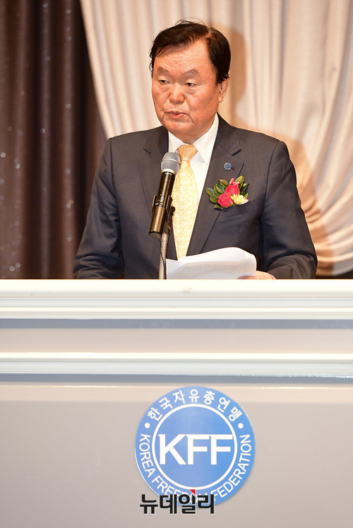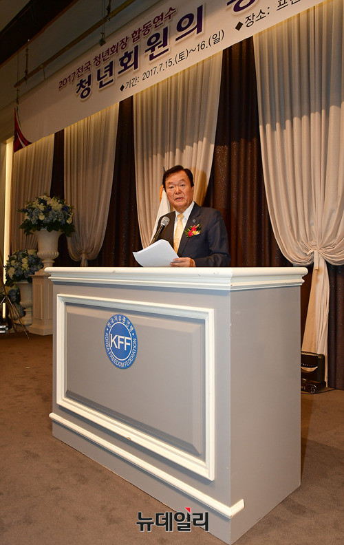 김경재 한국자유총연맹 총재가 15일 대구 남구 프린스호텔에서 열린 '2017 청년회장 합동 연수'에서 격려사를 하고 있다. 김 총재는 격려사를 통해 "역사의 길 위에 우뚝 서는 청년운동의 주인공이 되어 줄 것을 부탁한다"고 당부했다.