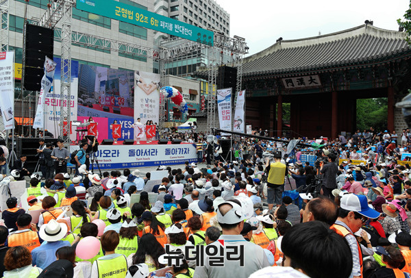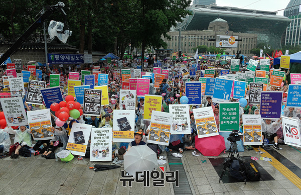 '동성애퀴어축제반대 국민대회' 참가자들이 15일 오후 서울 대한문광장에서 열린 집회에 참석해 동성애 반대 피켓을 들고 있다.