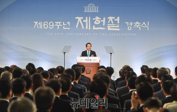 정세균 국회의장이 17일 오전 국회 로텐더홀에서 열린 '제69주년 제헌절 경축식'에서 축사를 하고 있다.
