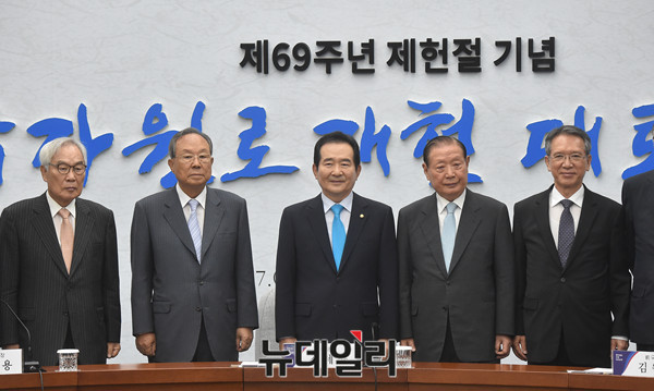 정세균 국회의장과 국가원로들이 17일 오전 국회에서 열린 '국가원로 개헌 대토론회'에 참석해 기념사진을 촬영하고 있다.(왼쪽부터) 이강국 전 헌법재판소장, 정의화, 임채정, 박관용 전 국회의장, 정세균 국회의장, 김원기, 김형오 전 국회의장, 이홍구 전 국무총리