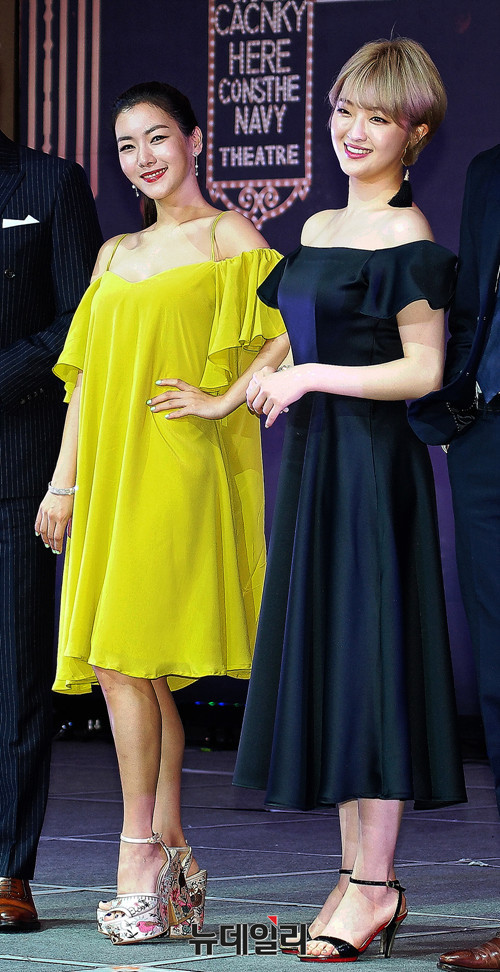 배우 오소연, 전예지(왼쪽부터)가 17일 오후 서울 중구 밀레니엄 서울힐튼 그랜드볼룸에서 열린 뮤지컬 '브로드웨이 42번가' 제작발표회에 참석해 포토타임을 갖고 있다.
