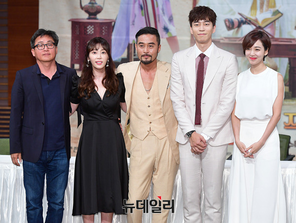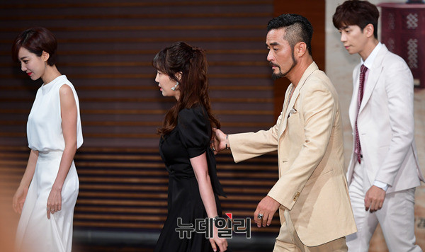 고동선 감독, 배우 강예원, 최민수, 신성록, 이소연(왼쪽부터)이 17일 서울 마포구 상암MBC 골든마우스홀에서 열린 수목 미니시리즈 '죽어야 사는 남자(연출 고동선, 극본 김선희)' 제작발표회에서를 마치고 인사를 하고 있다.