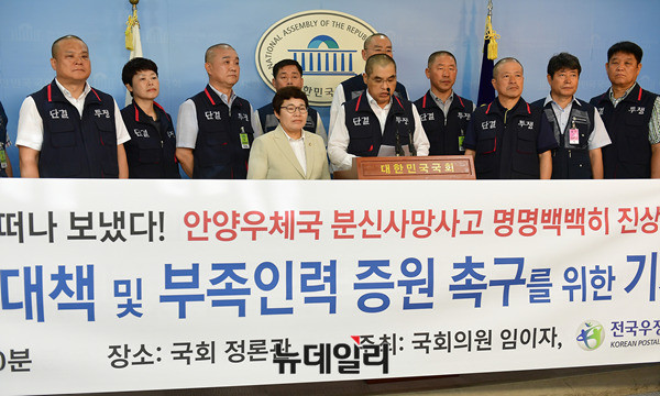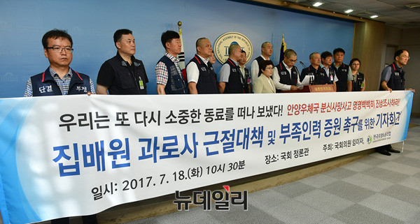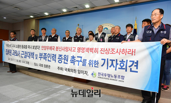 전국우정노동조합이 18일 오전 국회 정론관에서 기자회견을 열고, "집배원 부족인력 3,600명 즉각 증원하라"고 주장했다. 이들은 기자회견문을 통해 △과로사 특단 대책 촉구 △3,600명 즉각 충원 △비정규직 전원 정규직화 △경력직 공무원화 △특별근로 감독 강화 등을 요구했다.