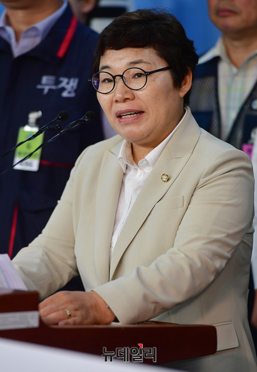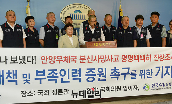 임이자 자유한국당 의원이 18일 오전 국회 정론관에서 열린 전국우정노동조합 기자회견에서 '집배원 부족인력 증원'을 촉구하고 있다. 기자회견에 참석한 조합원들은 회견문을 통해 △과로사 특단 대책 촉구 △3,600명 즉각 충원 △비정규직 전원 정규직화 △경력직 공무원화 △특별근로 감독 강화 등을 요구했다.