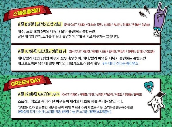 뮤지컬 '이블데드'가 여름방학을 맞아 독특한 스페셜데이를 마련했다.B급 코미디 좀비 호러 뮤지컬 '이블데드'는 숲속의 오두막으로 여행을 떠난 5명의 대학생들이 우연히 악령을 풀어주면서 좀비와 대결을 벌이는 내용을 담는다.먼저 주인공 '애쉬'와 '스캇' 역의 트리플, 더블 배우들을 한 무대에서 만날 수 있는 '애쉬X스캇 데이'를 8월 3일 공연에서 만날 수 있다. '애쉬' 역의 김대현·강동호·박강현과 '스캇' 역의 조권·우찬까지 5명의 배우가 연기, 노래를 번갈아 출연하며 절친한 친구 사이인 두 배역의 환상적인 호흡을 보여 줄 예정이다.이어 8월 10일 '네크로노미콘 데이'는 풍성한 군무와 신나는 EDM 음악으로 좀비들의 부활을 알리는 네크로노미콘 넘버를 일부 배역의 더블캐스트가 합세해 강력하고 특별한 좀비 댄스를 선보인다. 특히 '애니', '셀리'의 1인 2역을 연기하는 신의정·김려원 배우가 이날만큼은 '애니'역과 '셀리' 역을 나눠 출연한다.마지막으로 8월 17일에는 초록 피를 뿌리는 '그린 데이(Green Day)'가 진행된다. 매 회 좀비들이 직접 빨간 피를 뿌리며 관객들에게 짜릿함을 선사했던 이전 공연들과는 달리 관객들은 초록색의 피를 맞으며 색다른 재미를 만끽할 수 있다.뮤지컬 ‘이블데드’는 19일 오후 2시 마지막 티켓 오픈을 앞두고 있으며, 대학로 유니플렉스 1관에서 9월 17일까지 공연된다. 관람료 1만~7만7천원. 문의 1544-1555.