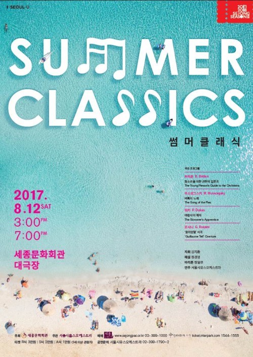 세종문화회관 서울시유스오케스트라(단장 김지환)은 2017 청소년음악회 '썸머클래식' 을 8월 12일 오후 3시, 7시 세종문화회관 대극장에서 2회 공연한다.