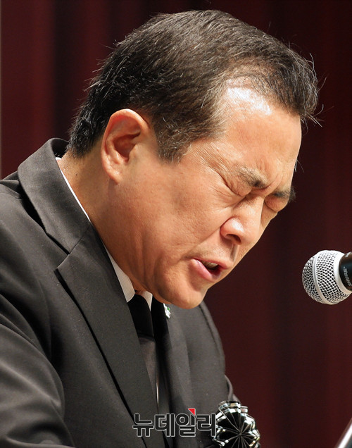 송기성 목사(정동제일교회)가 19일 오전 서울 국립서울현충원 현충관에서 열린 '우남 이승만 건국대통령 52주기 추모식'에 참석해 추모 기도를 하고 있다. 이날 행사에는 이승만 대통령 유가족과 이준 전 국방부장관, 이영훈 이승만학당 학장, 이인수 박사, 이경근 서울지방보훈청장 등이 참석했으나 피우진 국가보훈처장은 불참했다.