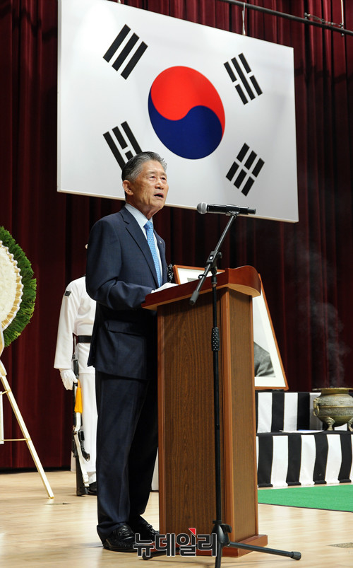 이준 전 국방부장관이 19일 오전 서울 국립서울현충원 현충관에서 열린 '우남 이승만 건국대통령 52주기 추모식'에 참석해 추모사를 하고 있다. 이날 행사에는 이승만 대통령 유가족과 이준 전 국방부장관, 이영훈 이승만학당 학장, 이인수 박사, 이경근 서울지방보훈청장 등이 참석했으나 피우진 국가보훈처장은 불참했다.