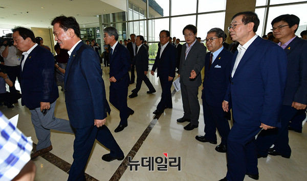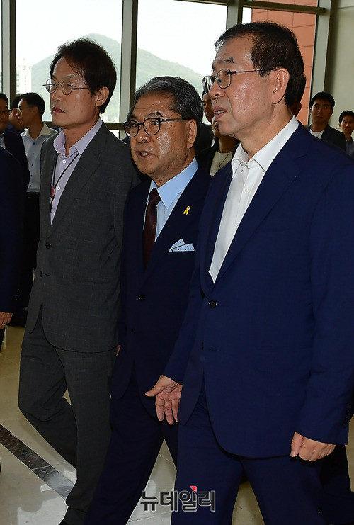 조희연 서울시교육감, 이재정 경기도교육감, 박원순 서울시장(왼쪽부터)이 19일 오후 서울 서초구 더케이호텔에서 열린 전국 시도교육감협의회 총회에 입장하고 있다.