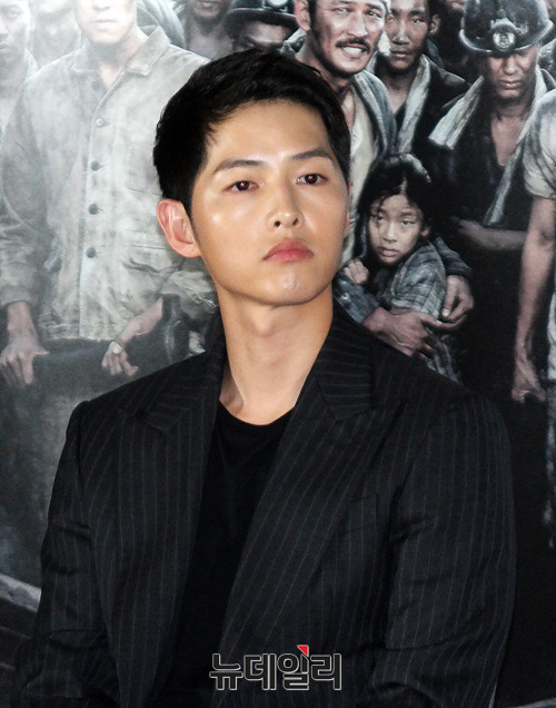 배우 송중기가 19일 오후 서울 용산구 CGV 용산아이파크몰에서 열린 영화 '군함도' 언론시사회에 참석해 인사말을 하고 있다.