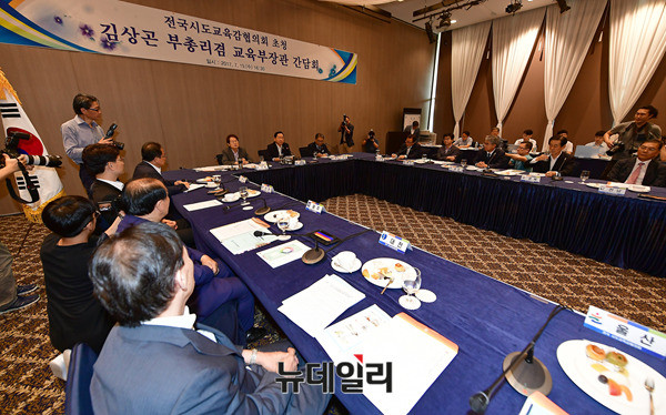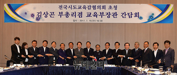 이재정 경기도교육감, 조희연 서울시교육감, 김상곤 사회부총리 겸 교육부장관(가운데)을 비롯한 전국 시도교육감들이 19일 오후 서울 서초구 더케이호텔에서 열린 전국 시도교육감협의회 초청 간담회에서 손을 맞잡고 포토타임을 갖고 있다.