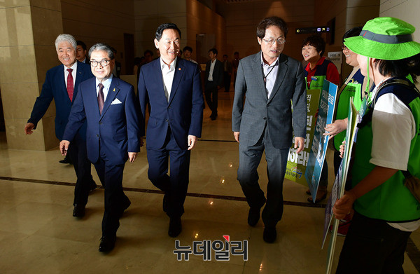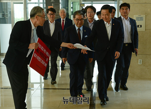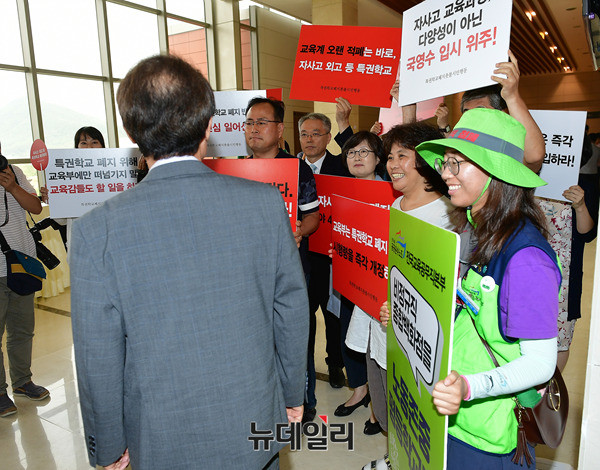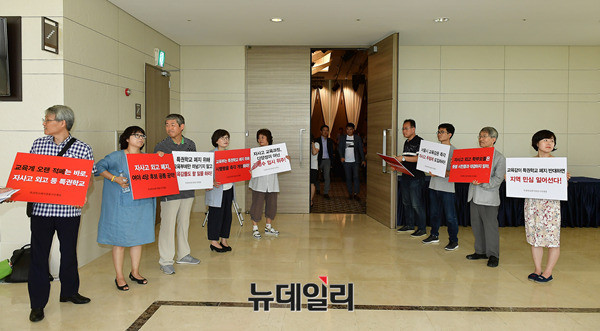 특권학교폐지촛불시민행동 회원들이 19일 오후 서울 서초구 더케이호텔에서 열린 전국 시도교육감협의회 총회에 앞서 자사고, 외고 등의 폐지를 요구하는 피켓을 들고 서 있다.