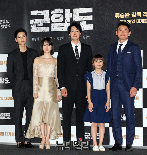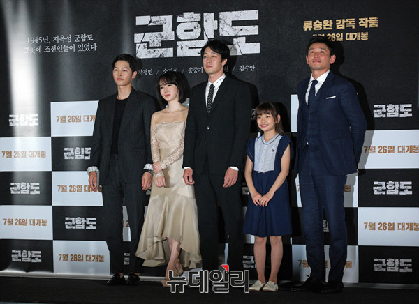 배우 송중기, 이정현, 소지섭, 김수안, 황정민(왼쪽부터)이 19일 오후 서울 용산구 CGV 용산아이파크몰에서 열린 영화 '군함도' 언론시사회에 참석해 포토타임을 갖고 있다.