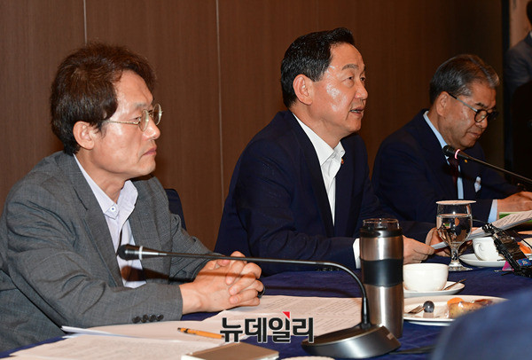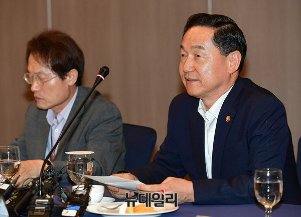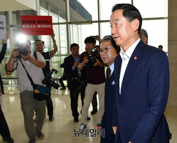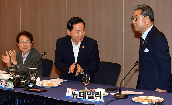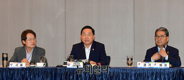 김상곤 사회부총리 겸 교육부장관이 19일 오후 서울 서초구 더케이호텔에서 열린 전국 시도교육감협의회 초청 간담회에 참석해 발언 하고 있다. 간담회는 김 장관 모두 발언 이후 비공개 진행됐다. 앞서 열린 총회에는 박원순 서울시장이 축사를 맡았다.