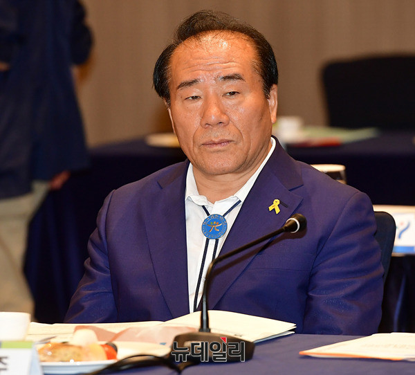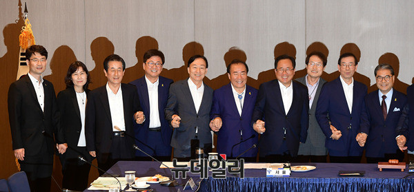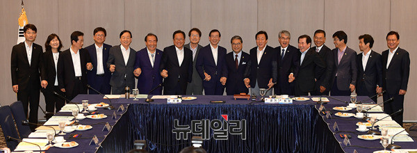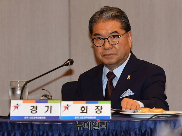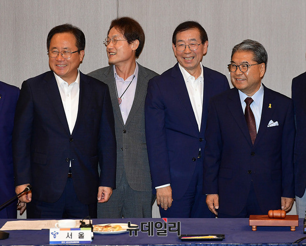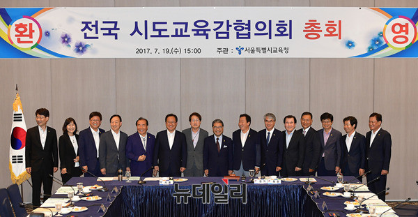 조희연 서울시교육감, 이재정 경기도교육감을 비롯한 시도교육감이 19일 오후 서울 서초구 더케이호텔에서 열린 총회에 참석해 포토타임을 갖고 있다. 이날 총회에는 박원순 서울시장이 축사를 맡았다. 총회 직후 열린 김상곤 사회부총리 겸 교육부장관과의 간담회에는 비공개로 진행됐다.