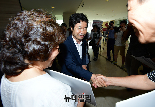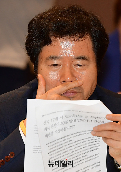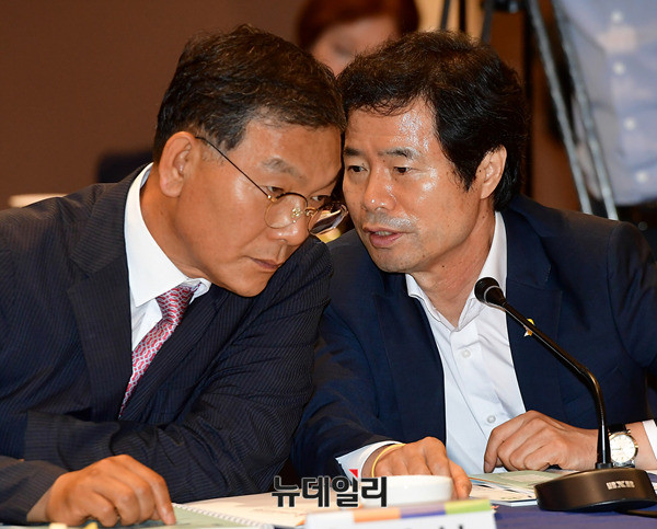 장만채 전남교육감과 김승환 전북교육감(왼쪽부터)이 19일 오후 서울 서초구 더케이호텔에서 열린 전국 시도교육감협의회 총회에 참석해 대화를 나누고 있다. 이날 총회에는 박원순 서울시장이 축사를 맡았다. 총회 직후 열린 김상곤 사회부총리 겸 교육부장관과의 간담회에는 비공개로 진행됐다.