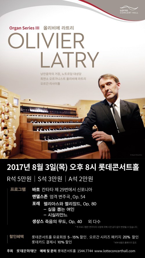 노트르담 대성당 최연소 오르가니스트인 올리비에 라트리(55)가 '롯데콘서트홀 파이프오르간 시리즈' 세 번째 무대의 주인공으로 나선다.