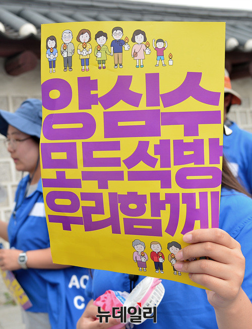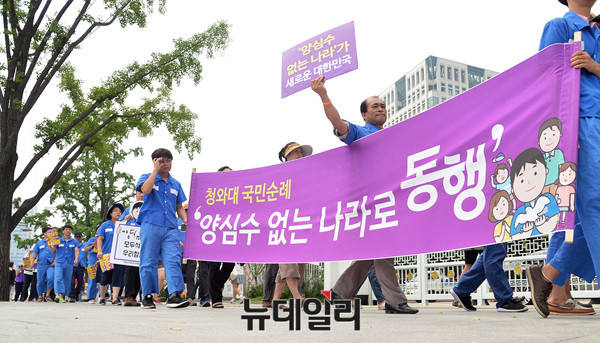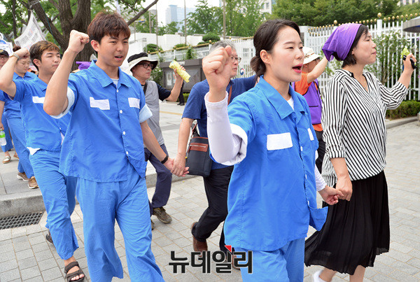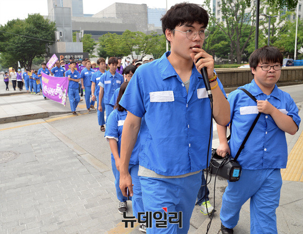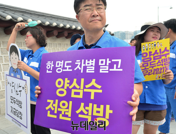 양심수석방추진위원회가 21일 오전 광화문역에서 청와대 앞 분수대까지 '이석기 전 통합진보당 의원과 한상균 민주노총 위원장 등의 석방을 주장'하며 가두행진을 벌이고 있다. 이날 추진위는 지난 19일 청와대의 8·15 특별사면 불가 입장을 비판했다.